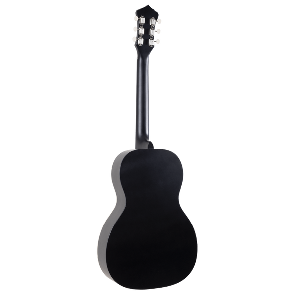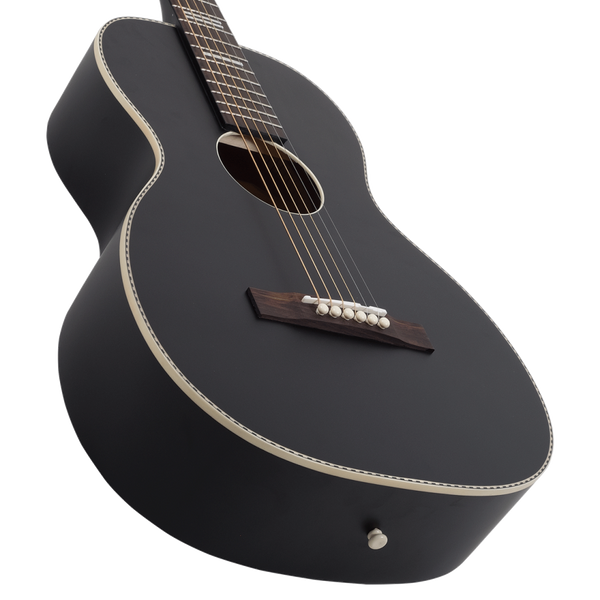 El diapasón de ovangkol con incrustaciones Harmonella, los clavijeros niquelados con botones color marfil y el acabado negro mate satinado conforman un conjunto visual elegante y atemporal.