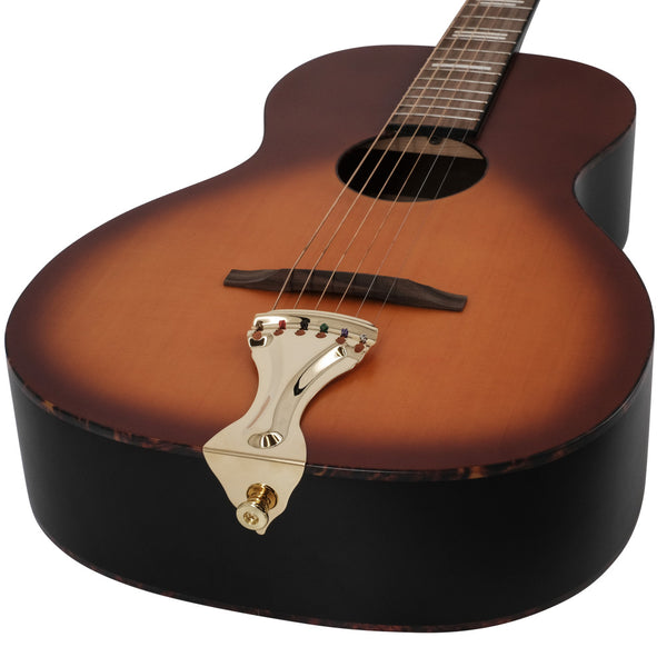 El puente flotante y el cordal dorado aportan un timbre clásico y una respuesta única que recuerda a las primeras guitarras Dirty 30s de Recording King.