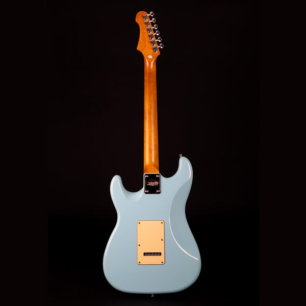 Esta Jet es una guitarra de estilo S, con cuerpo de Tilo, Mástil de arce tostado, diapasón de arce Canadiense y cejuela de hueso. Monta 3 pastillas cerámicas simples con un selector de 5 posiciones, control de volumen y dos de tono. Acabado Sonic Blue.