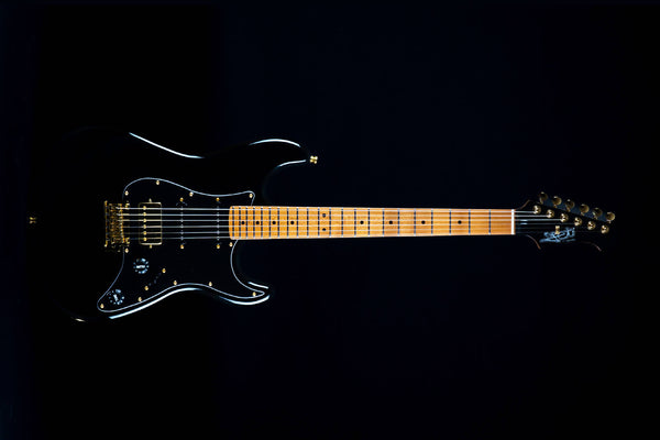 Tipo Modern Stratocaster. Mástil de arce Canadiense y diapasón de palorosa . Cuerpo de Tilo. Cejuela diapasón de hueso. 2 pastillas simples y 1 doble cerámicas. Selector de 5 posiciones. 1 control de volumen y 1 de tono. 22 trastes. Acabado Negro con herrajes dorados.